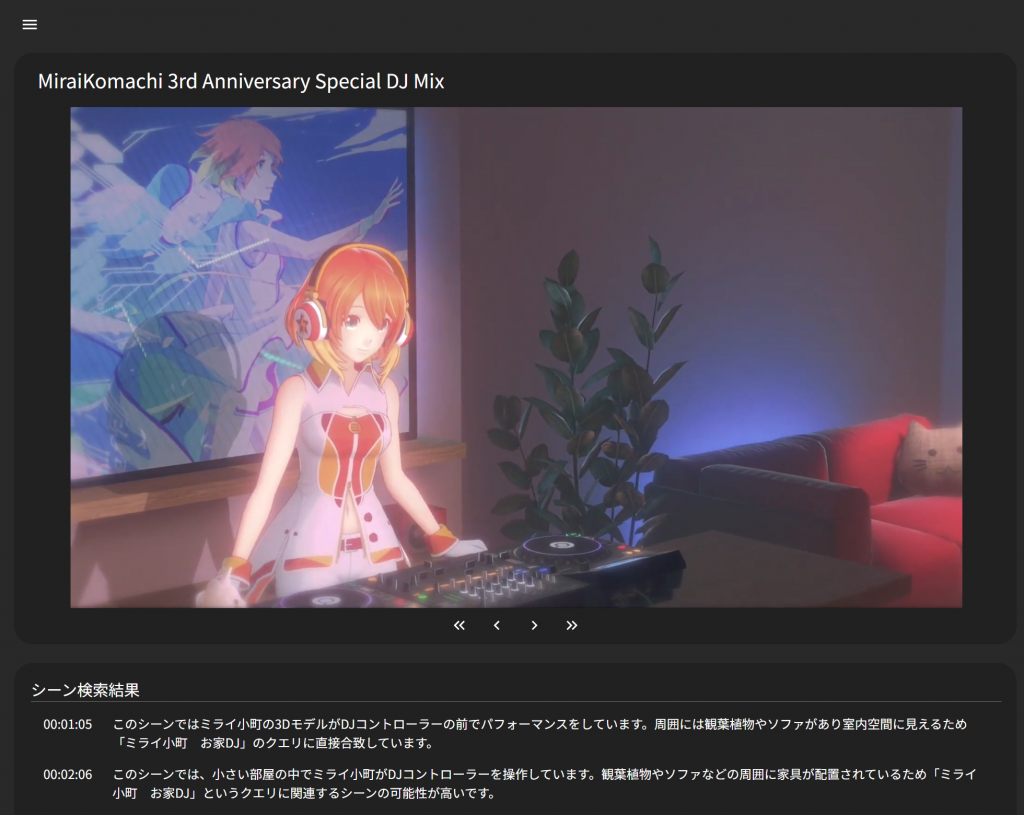 「スマート検索エンジン」により、テキスト入力で映像内のシーンを検索できるシステム。「IP特化型・動画検索サービス」同様、制作および商品開発などで活用されており、キャラクター名や舞台名などのIP独自の固有名詞や、あいまいなワードでも検索することが可能です。また、映像作品の場合、作品名や何話のどのシーンか、時間とともにサムネイル表示され、即時にそのシーンから見ることができます。
