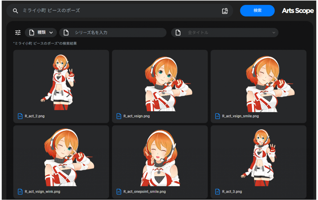ご参考:「ミライ小町 ピースのポーズ」で検索した画面